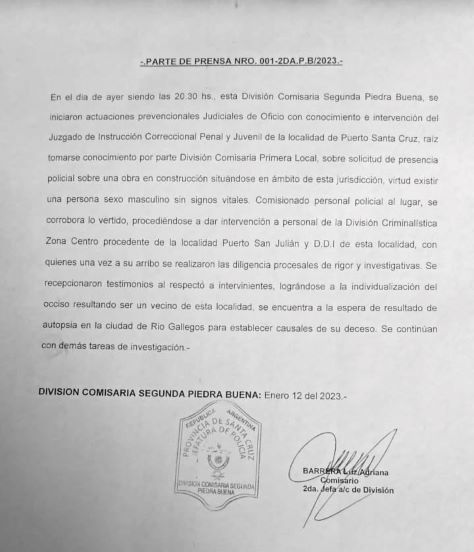 En el día de ayer en la localidad de Comandante Luis Piedra Buena, fue hallado el cuerpo sin vida de un hombre mayor de edad, el mismo se encontraba en una obra en construcción.